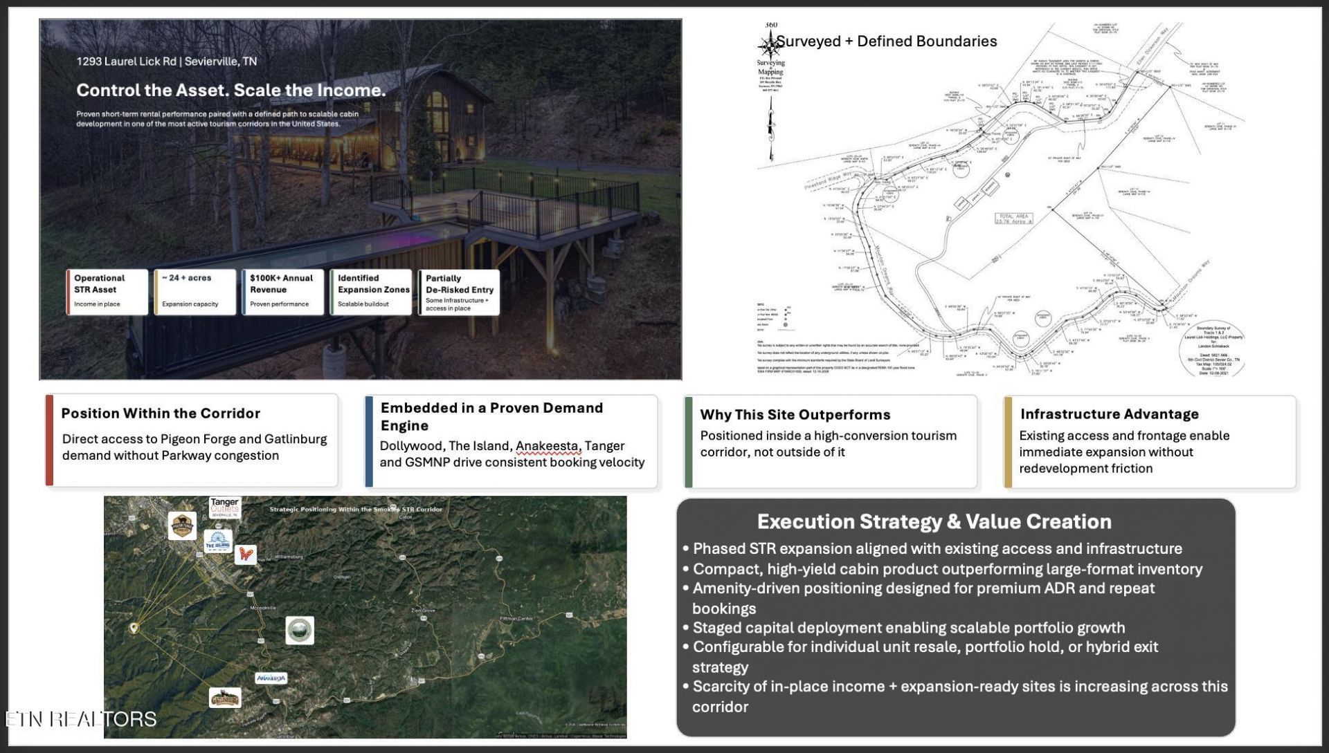 Strategic short-term rental development opportunity offering 24+ acres in one of the Smoky Mountains' most proven tourism corridors, with direct access to Pigeon Forge, Gatlinburg, Dollywood, The Island, and the Great Smoky Mountains National Park. Positioned inside the demand--not outside of it--this property benefits from consistent booking velocity, year-round visitation, and one of the strongest tourism economies in the Southeast.This is not a raw land offering. The property is anchored by an income-producing short-term rental generating $100,000+ annually, providing immediate revenue while future expansion is executed. Existing improvements, access, and infrastructure create a partially de-risked entry point for buyers seeking both stability and upside. The homes boats 4 bedrooms with 2 additional sleeping areas, 3 full baths and 4800 square feet. The site supports a phased development strategy designed to scale unit count and overall revenue over time. Identified expansion areas, combined with favorable topography and layout, allow for additional cabin placements without disrupting current operations. A new survey and site plan proposal are in progress, focused on maximizing the property's highest and best use through intentional, phased growth.The existing asset demonstrates a proven, experience-driven rental model. Configured for large-group occupancy, it features high-value amenities including a pool, hot tub, pickleball court, and expansive indoor and outdoor gathering areas. These elements drive premium nightly rates, repeat bookings, and strong guest demand, providing a clear blueprint for future unit design and positioning.From a development perspective, this property offers multiple execution paths. Buyers can expand with compact, high-yield cabin product designed to optimize revenue per square foot, pursue a boutique STR community layout, or structure a build-to-sell strategy that increases total inventory and exit optionality. The ability to control an operating asset while scaling additional units creates a rare alignment of immediate cash flow and long-term value creation.Located within a high-conversion tourism corridor supported by millions of annual visitors and ongoing capital investment, the property is positioned to capture sustained demand from both regional and national travel markets. Continued growth in the area reinforces long-term appreciation and revenue potential.Opportunities that combine in-place income, scalable acreage, and expansion-ready infrastructure in this location are increasingly limited. This offering is well-suited for developers, builder-operators, and investors seeking a disciplined path to growth within a high-demand short-term rental market.This is more than a property--it is a scalable income and development platform with a clear path to executionVirtual tour available upon request