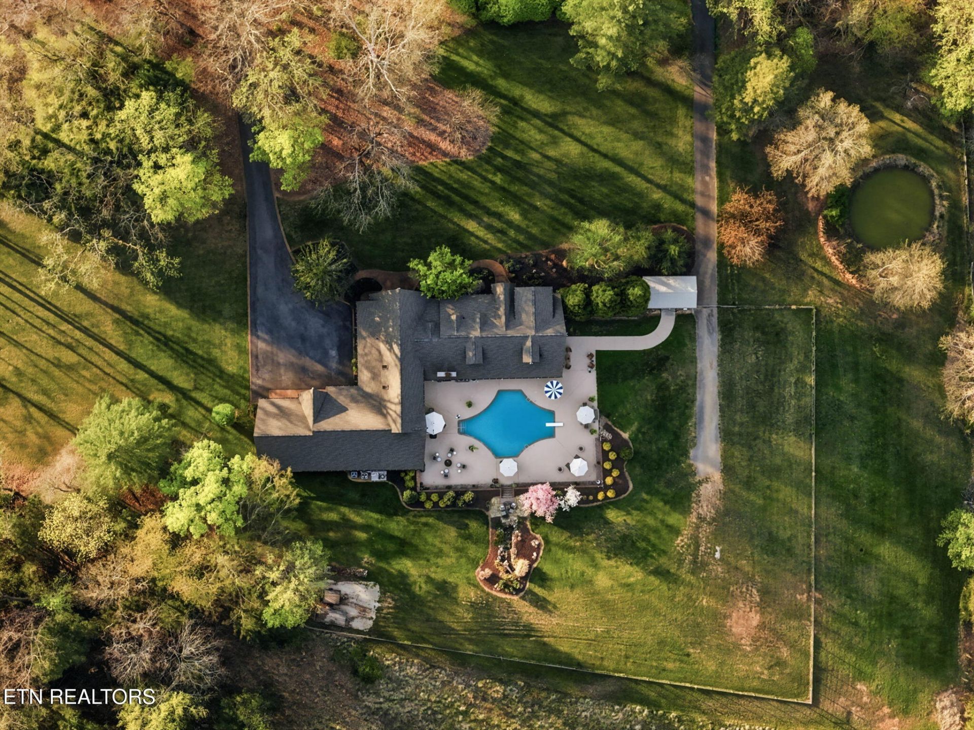 Spectacular estate resting on 8.97 acres, surrounded by scenic Appalachian Mountain beauty, mature landscaping, wooded privacy, two tranquil ponds, and picturesque views of the Holston River from the front porch! As you approach, a winding driveway leads you to the residence, showcasing the home's distinctive architecture and the unique blend of exterior finishes that set it apart. Offering over 7,000 square feet of living space, the home combines scale with striking natural surroundings. This exceptional property truly offers it all, designed with both luxury and entertaining in mind. Defined by strategically placed soaring ceilings that invite an abundance of natural light, the open floor plan spans the entire home from the moment you enter. The seamless flow creates a sense of openness, warmth, and effortless connection throughout. Living in Northeast Tennessee means experiencing the beauty of every season. On cooler evenings, the den's dramatic full-wall fireplace becomes the perfect gathering place, relaxing by the fire, enjoying the gentle crackle, and sipping hot chocolate or your favorite beverage. Flowing seamlessly into a second living area is an extraordinary sunroom. This show-stopping space features cathedral ceilings, a second kitchen/bar area, rich brick flooring and exposed brick walls. Summer truly shines here, centered around the incredible resort-style pool retreat. If you love to entertain, this setting is second to none. The waterfall serves as a stunning focal point, adding both serenity and visual appeal to the outdoor space. End the day gathered around the fire pit on a cool evening, the perfect way to unwind. Thoughtfully designed for multi-generational living, the home features two kitchens, two laundry areas, and flexible spaces that can easily accommodate private living quarters. It offers 4 bedrooms and 4 full baths, including a main-level primary suite and an additional primary option upstairs. Meticulously maintained with all the work already completed. Featuring a brand-new saltwater pool with decking and waterfall, beautifully remodeled baths, a new roof, gutters, HVAC, appliances and so much more. Select furnishings may be negotiable with an acceptable offer. Beyond its appeal as a private estate, this property offers investment potential. Ideally suited for short-term rentals, with ample acreage for additional cabins or homes, it also presents exciting possibilities as an event venue. Conveniently located in the Tri-Cities, offering easy access to a wide variety of dining, shopping, top-rated schools, parks, medical facilities, the airport, Bristol Motor Speedway, Hard Rock Casino, Bristol's birthplace of country music, Abingdon's vibrant arts scene, and endless outdoor recreation including golf, hiking, biking, boating, and fishing for outdoor enthusiasts. Turn-key, resort-style living ready to welcome its next owner!